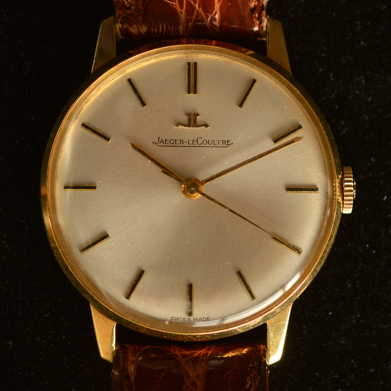 15-steens cal. 885 zilverkleurige wijzerplaat met gouden indices en gouden wijzers, gepolijste ronde kast met drukdeksel, kroon gesigneerd LeC aan een krokodillenleren Jaeger-LeCoultre band.